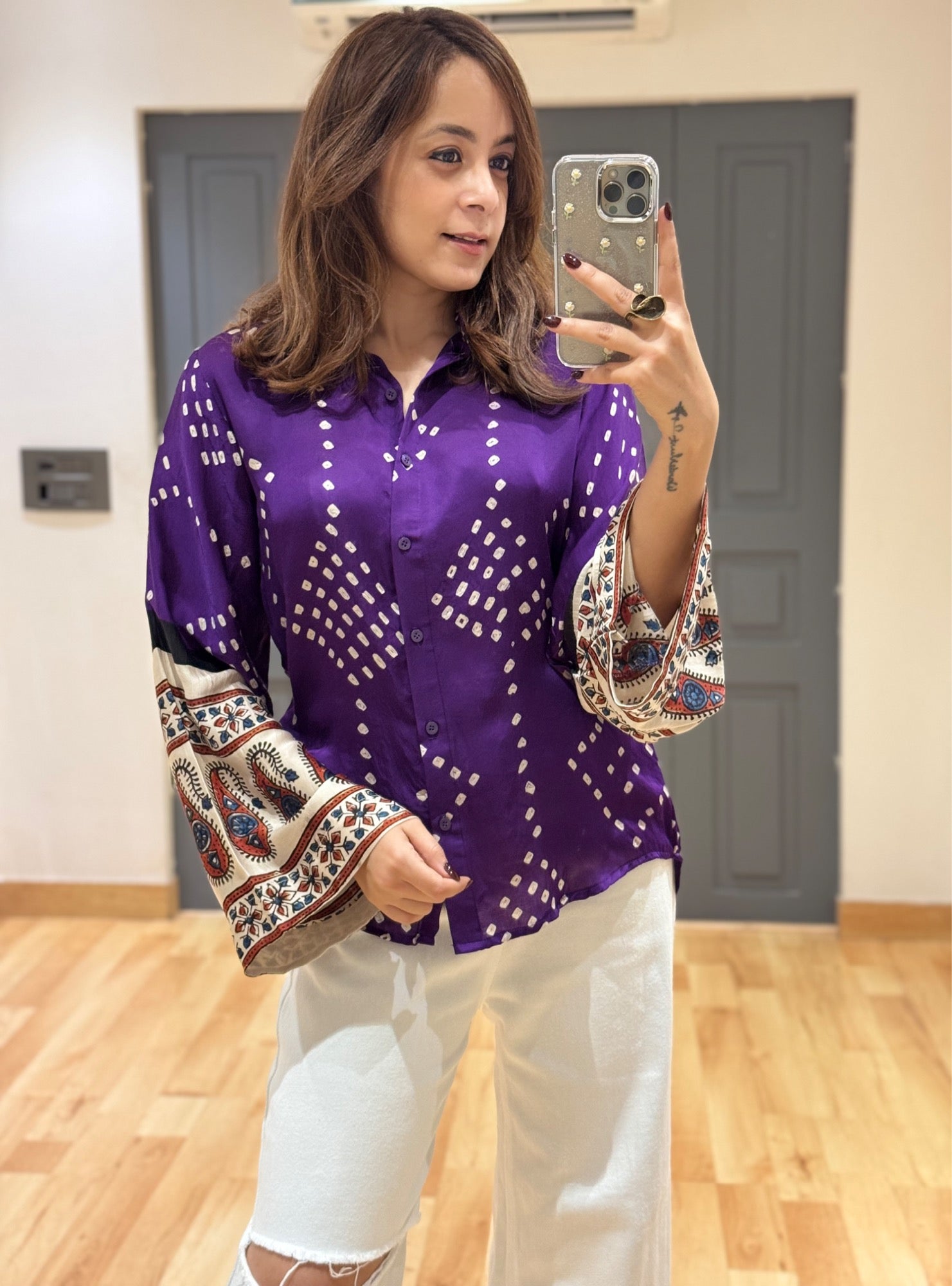 Royal Purple Bandhani Print Shirt with Intricate Ethnic Border Cuff Detail